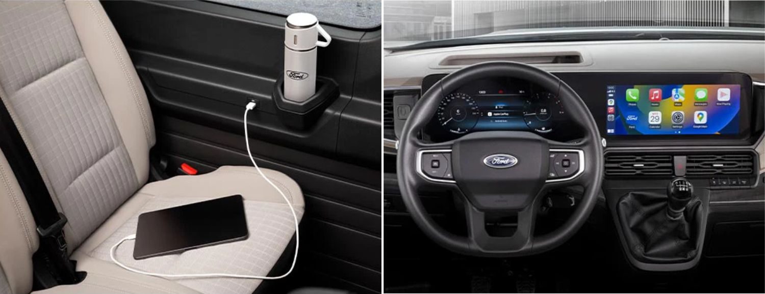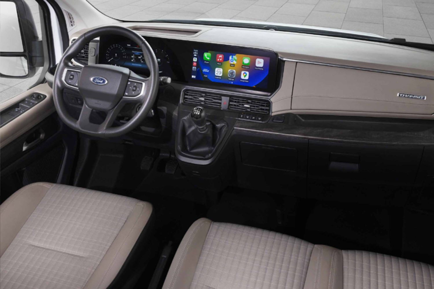 Lần đầu tiên, Ford Transit được trang bị màn hình đôi cỡ lớn. Màn hình trung tâm có tính năng cảm ứng hỗ trợ kết nối Apple CarPlay® và Android Auto™ không dây, hỗ trợ bản đồ dẫn đường, điện thoại rảnh tay, giải trí cùng nhiều tính năng khác.